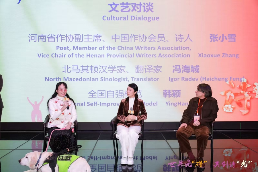 “我扶着手杖,既是音符,也是指挥棒/左脚追问土地,右脚回答海浪/节拍里,我把自己,走成一张活地图/我翻译斜坡的暗语,也懂得台阶的叹息/把每一次颠簸,改写成平坦的韵脚/让后来者的脚印,不再踉跄……”12月9日晚,上海书城福州路店里,诗意流淌、暖意融融,塑料挤出机视障者王林与听障者王玉婷以朗诵与手语结合的形式演绎了残疾诗人陈艺新创作的《双重奏》,全场响起热烈掌声。